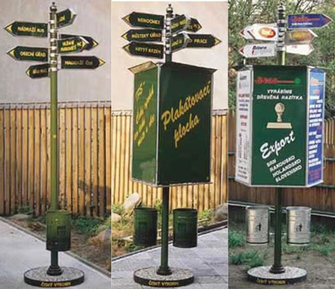 Nosný prvek je ocelová trubka o průměru 76 mm, žárově zinkovaná a upravená barvou dle RAL. Informační šipky jsou taktéž žárově zinkovány. Uchycení a nasměrování šipek je za pomocí objímek. Cedulky jsou vyrobeny z Al plechu o síle 1,5 mm. Ukončení sloupu je ozdobnou hlavicí a přírubou ve spodní části. Na nosný sloup lze umístit otočný tříboký nebo pětiboký informační systém a odpadkový koš o objemu 20l.